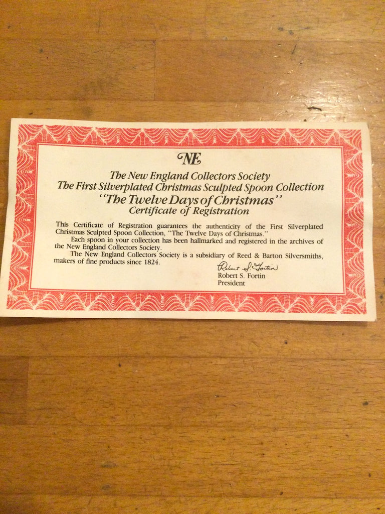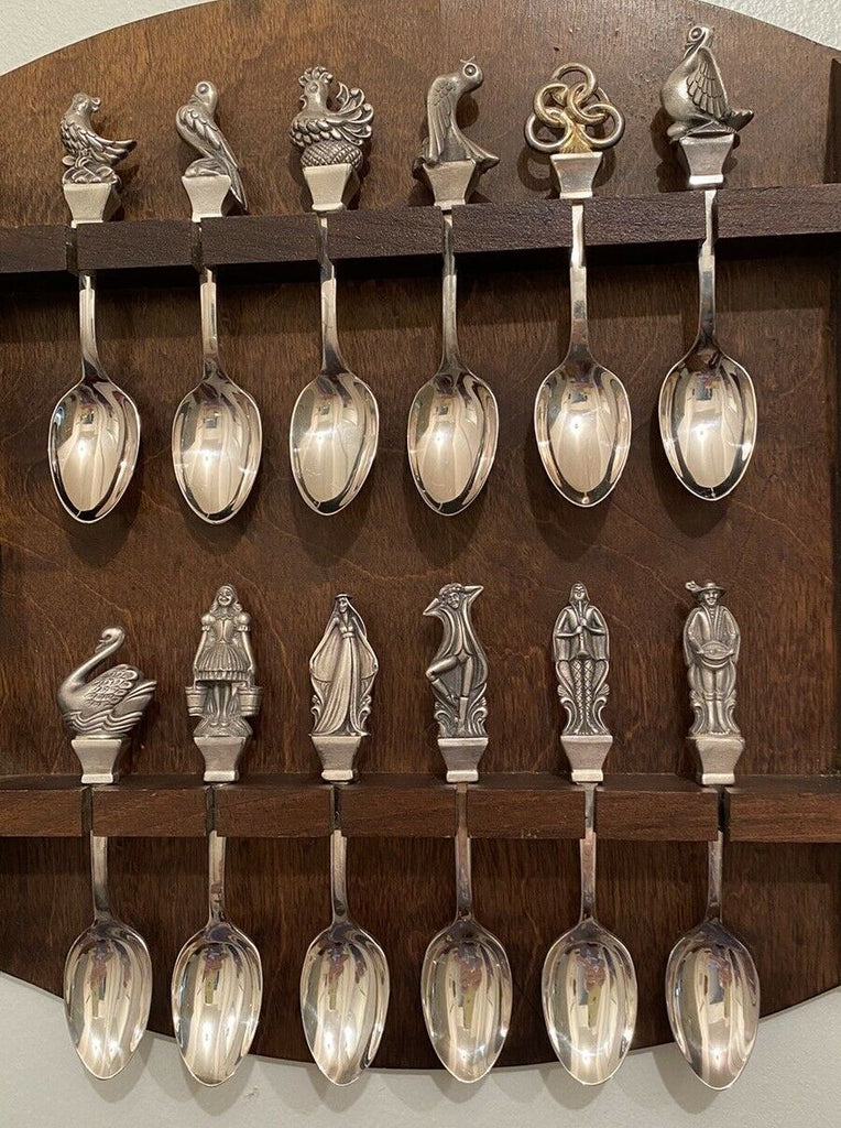 Now GUESS WHAT, i have found spoons representing the 12 gifts of the 12 days of Christmas! 1) a partridge 2) a turtle dove 3) a french hen 4) a calling bird 5) five golden rings 6) a laying goose 7) a swimming swan 8) a milking maid 9) a dancing lady 10) a leaping lord 11) a piping piper 11) a drumming drummer (it is old english :)