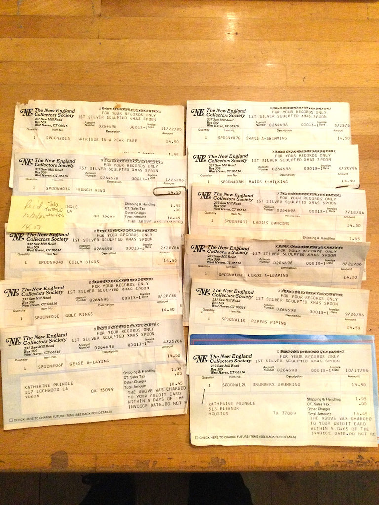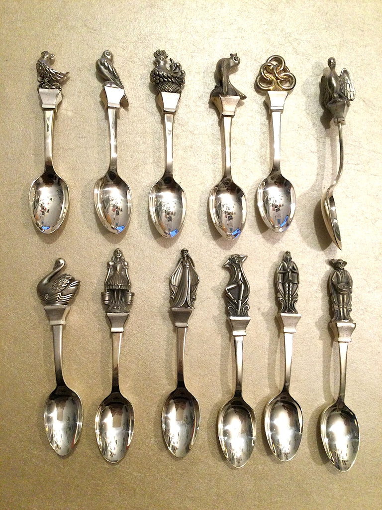 That's an incredible and rare find, and on top of it, i have the original receipts for each spoon, which were purchased one per month between 1985-1986 from a lady in Yukon in Canada. The figures are made of pewter and the handles are silverplate.