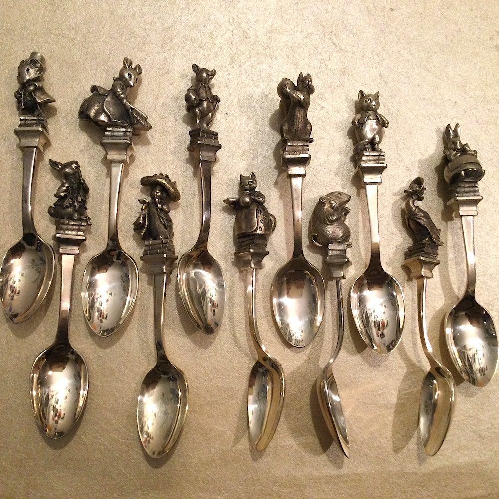 A collection of 11 spoons with the different characters of Peter Rabbit and friends: